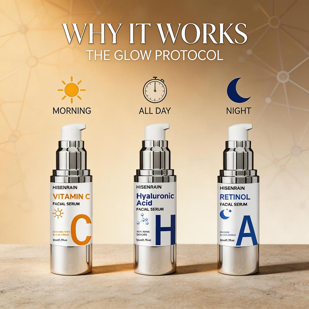 Most women have the right ingredients — they just don't have the right order. Vitamin C in the morning protects and brightens. Retinol at night renews and smooths. Hyaluronic Acid locks in hydration all day long.